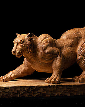 虎が獲物を狙って身構え、鋭く見詰めながら、転じて好機が訪れ飛び掛かる瞬間の様子を彫刻いたしました。中国の四聖獣の中で、龍とよく対比されるされるのが“白虎”です。虎は百獣の王で、その猛威と伝説中の妖怪を打ち滅ぼす能力により、陽の神獣とされるようになり、よく龍と一緒に出てきます。“雲は龍から、風は虎から”といい、魔物たちが最も恐れる存在となりました。